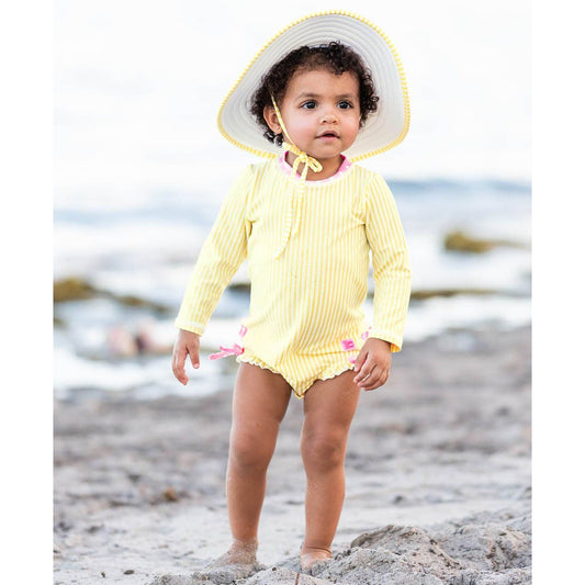 Regular price $42.00 USDRegular priceUnit price perSale price $42.00 USDBaby Girls Banana Seersucker Long Sleeve One Piece Rash Guard Swimsuit with Signature Rear Ruffles