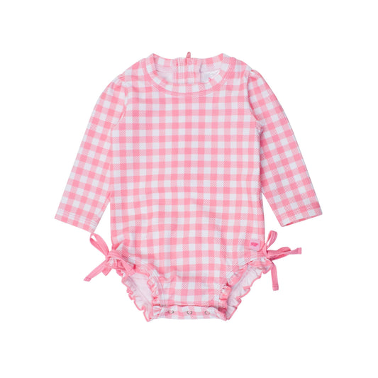 Baby Girls Bubblegum Gingham Long Sleeve One Piece Rash Guard Swimsuit with Signature Rear Ruffles
