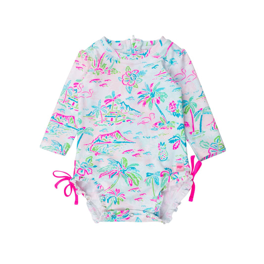 Baby Girls Tropical Resort Long Sleeve One Piece Rash Guard Swimsuit with Signature Rear Ruffles