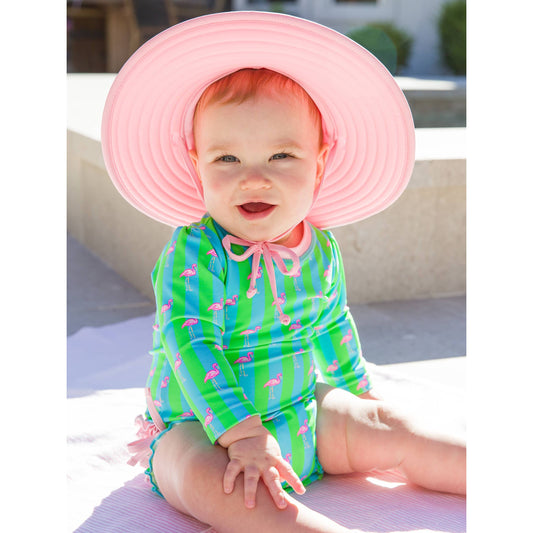 Baby Girls Neon Flamingo Stripe Long Sleeve One Piece Rash Guard Swimsuit with Signature Rear Ruffles