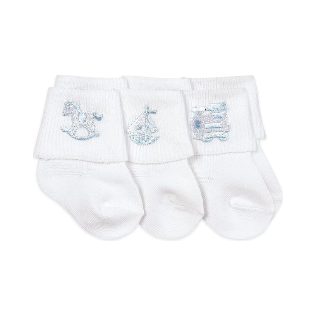Baby boy classic white turn cuffs with light blue embroidered pattern appliques. These socks feature an ultra-smooth toe for added softness that provides unsurpassed comfort. These soft cotton socks are perfect for newborn babies, infants, and toddlers.