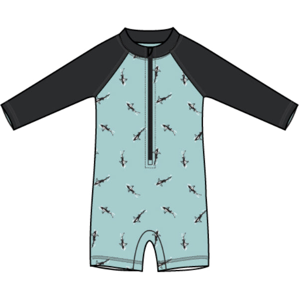 Crafted from soft knit fabric, this BABY BOY SWIM ROMPER is perfect for warm days ahead. Featuring a playful aqua shark print, your little one will make a splash at any pool or beach. The lightweight and breathable material provides comfort while protecting delicate skin from the sun's harmful rays.