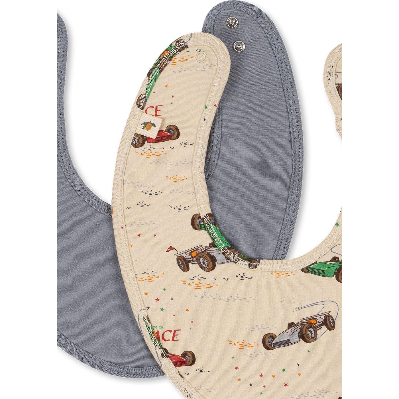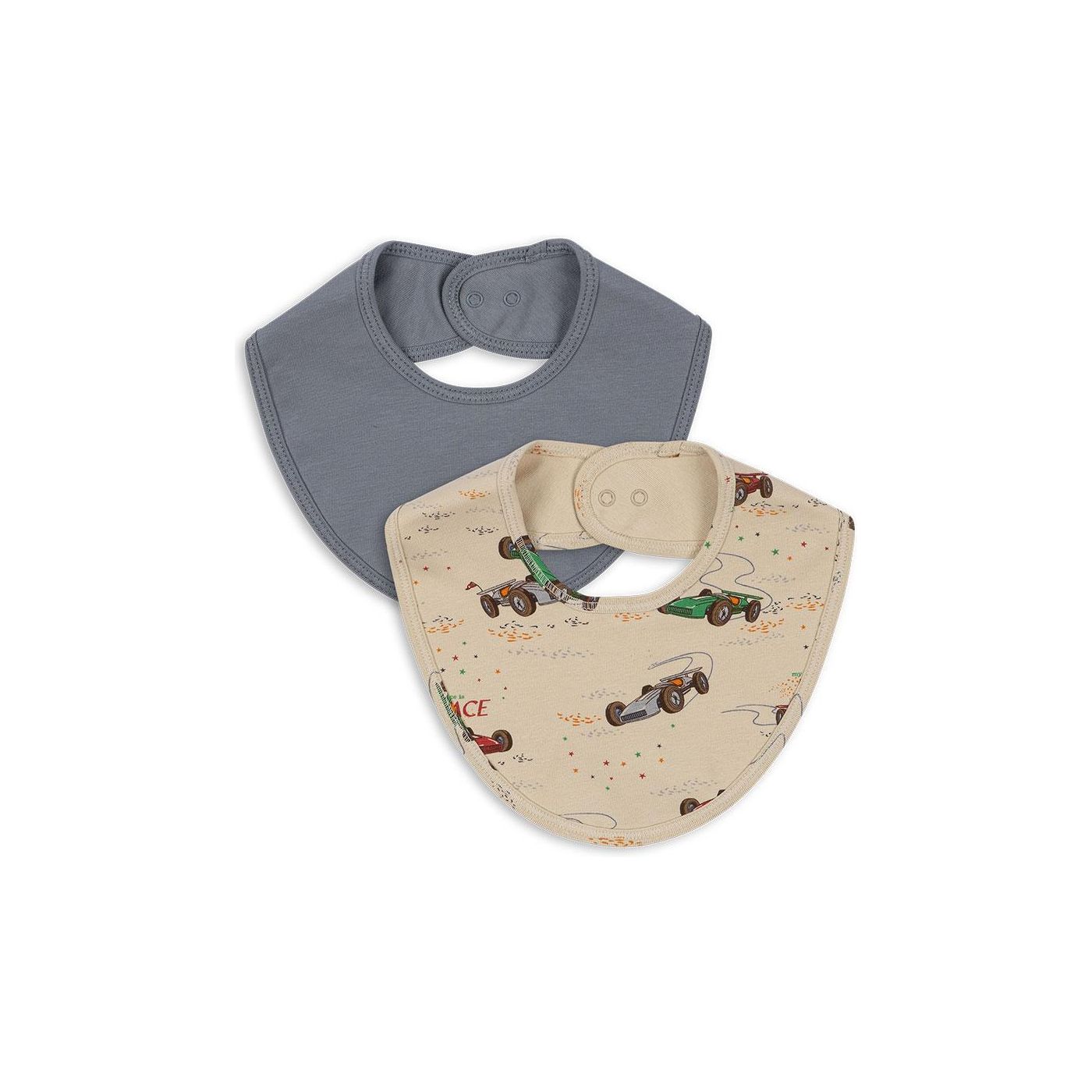 Soft bibs with press button closure. Feature two adjustment levels for a comfy fit. Made from 95% organic cotton, 5% elastane, and 100% polyester.