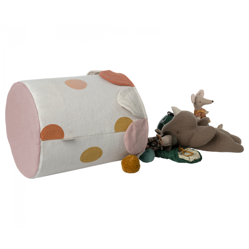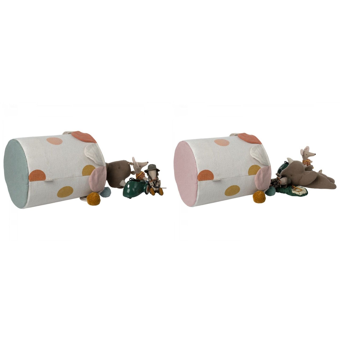 This colorful, soft basket is the perfect storage for any playroom. Close the basket to hide the mess! This basket comes in two color versions, one with a rose and one with a chinos green bottom. Mix it with the other Maileg interior styles.