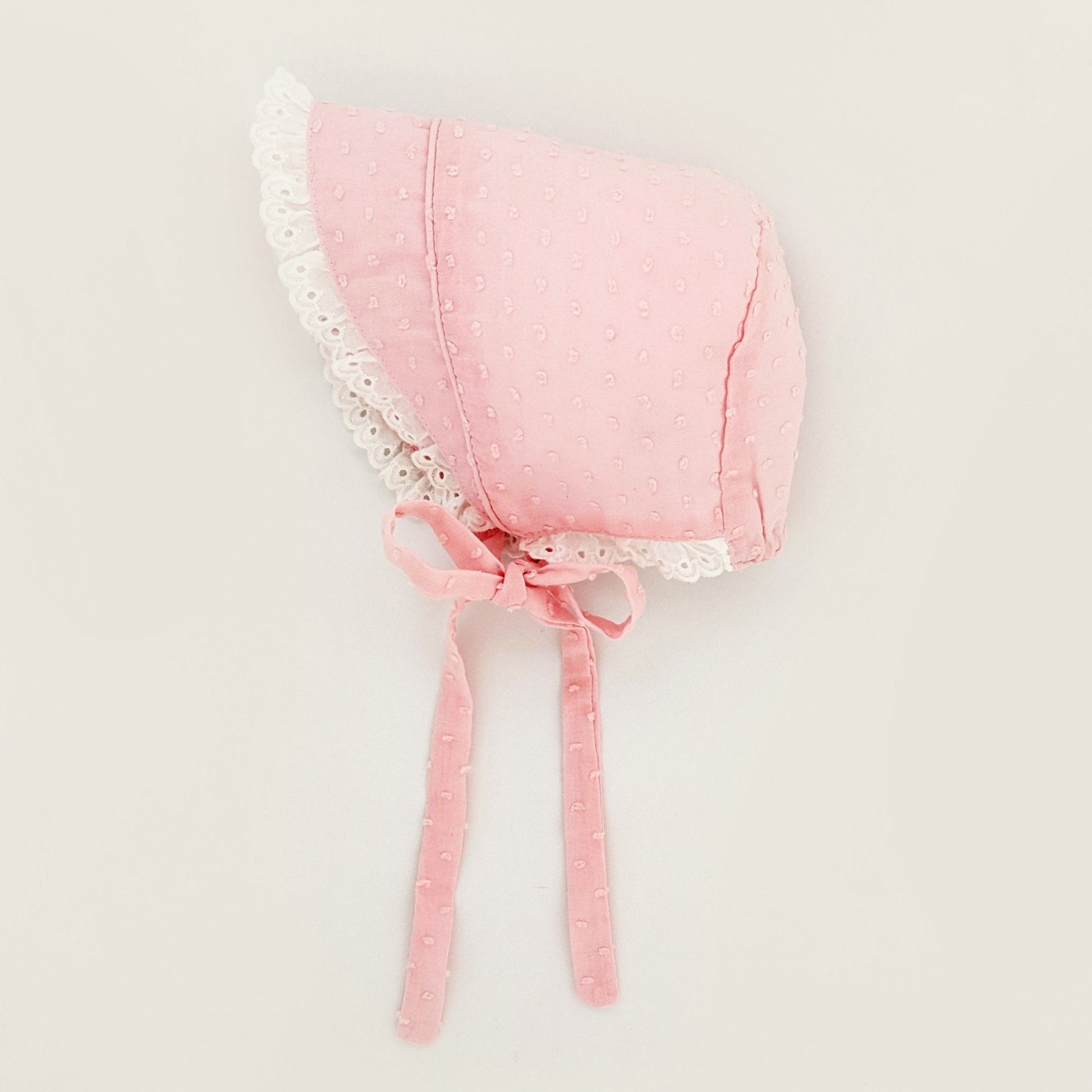 Our classic bonnet made in white cotton Clip Dot fabric, with little dots of clipped threads. Eyelet lace trim around the brim makes this even more feminine. Elastic at back of neck adds a bit of fit. This ties closed to keep bonnet in place.