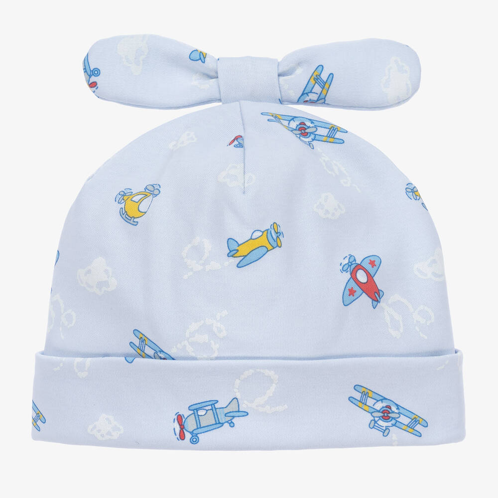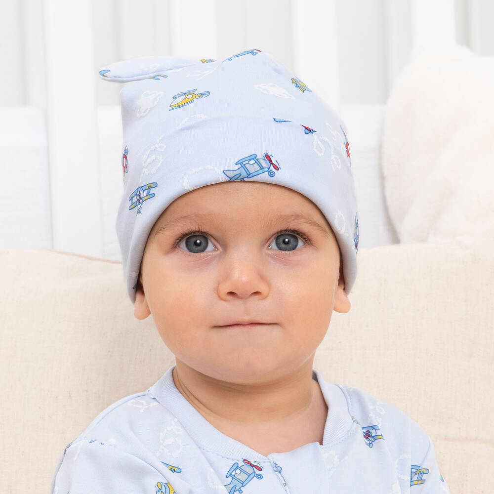 Blue hat for baby boys by Kissy Kissy, made in super soft and stretchy Pima cotton jersey. This double layer hat has a colourful aeroplane print, with a turned-up brim and a cute 'propeller' on the top.