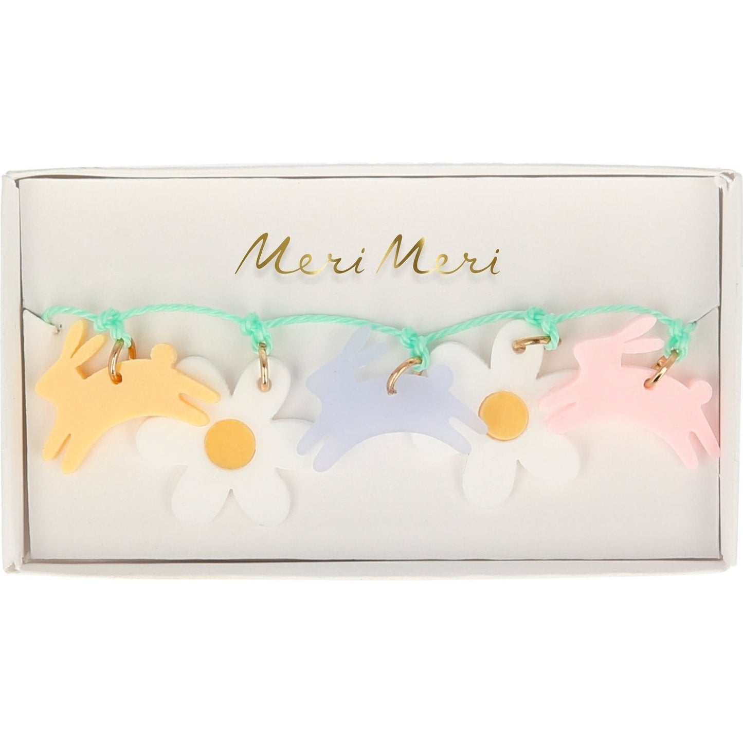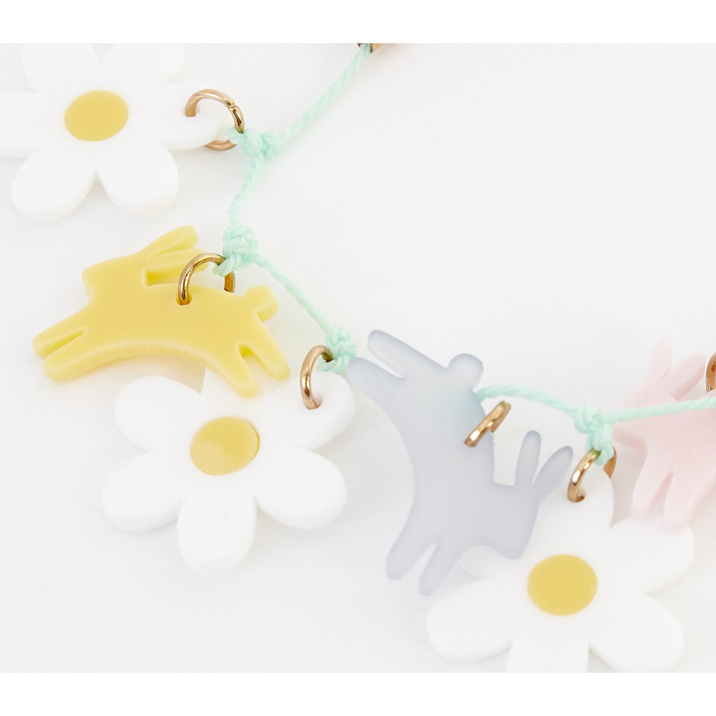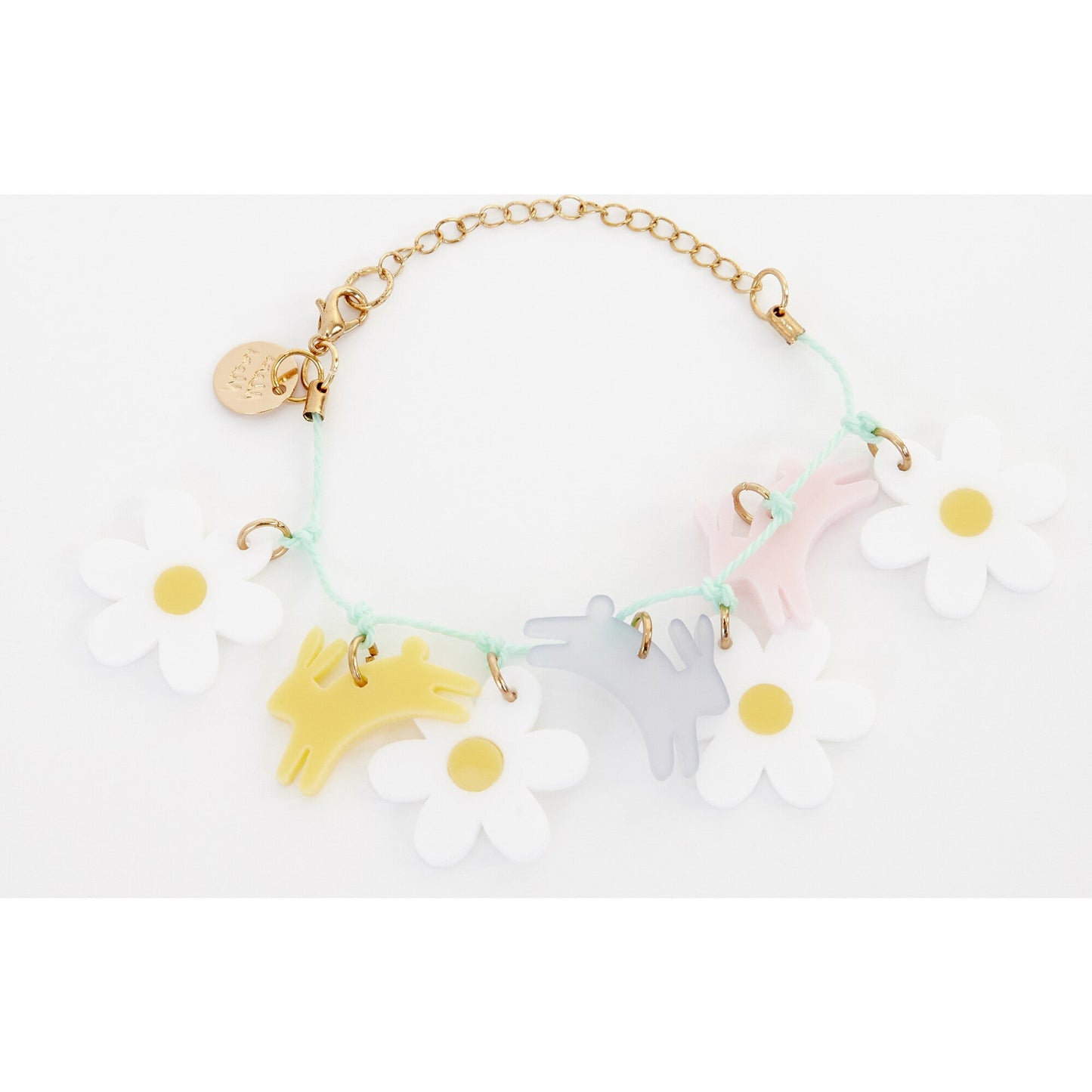 This beautiful bracelet is a fabulous gift for Easter, or any springtime celebration. It’s crafted with acrylic bunnies and daisies, and makes the most amazing accessory.