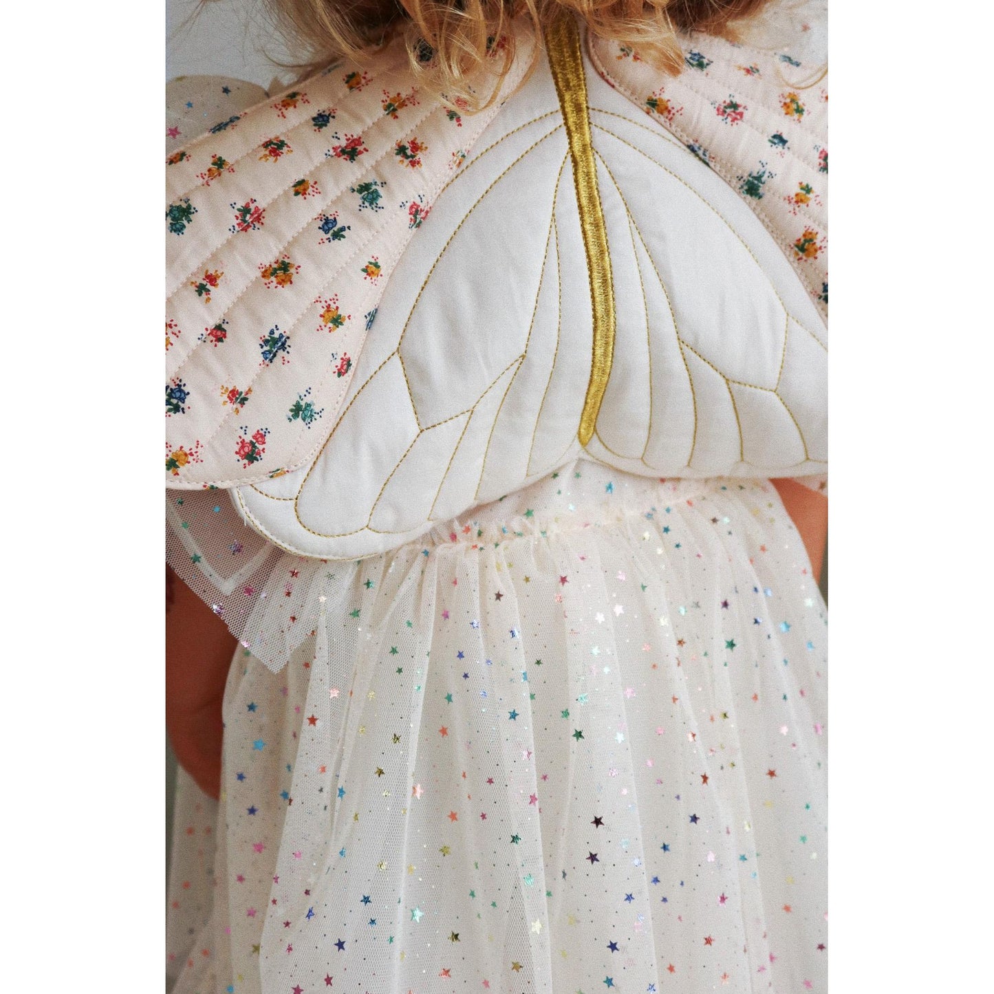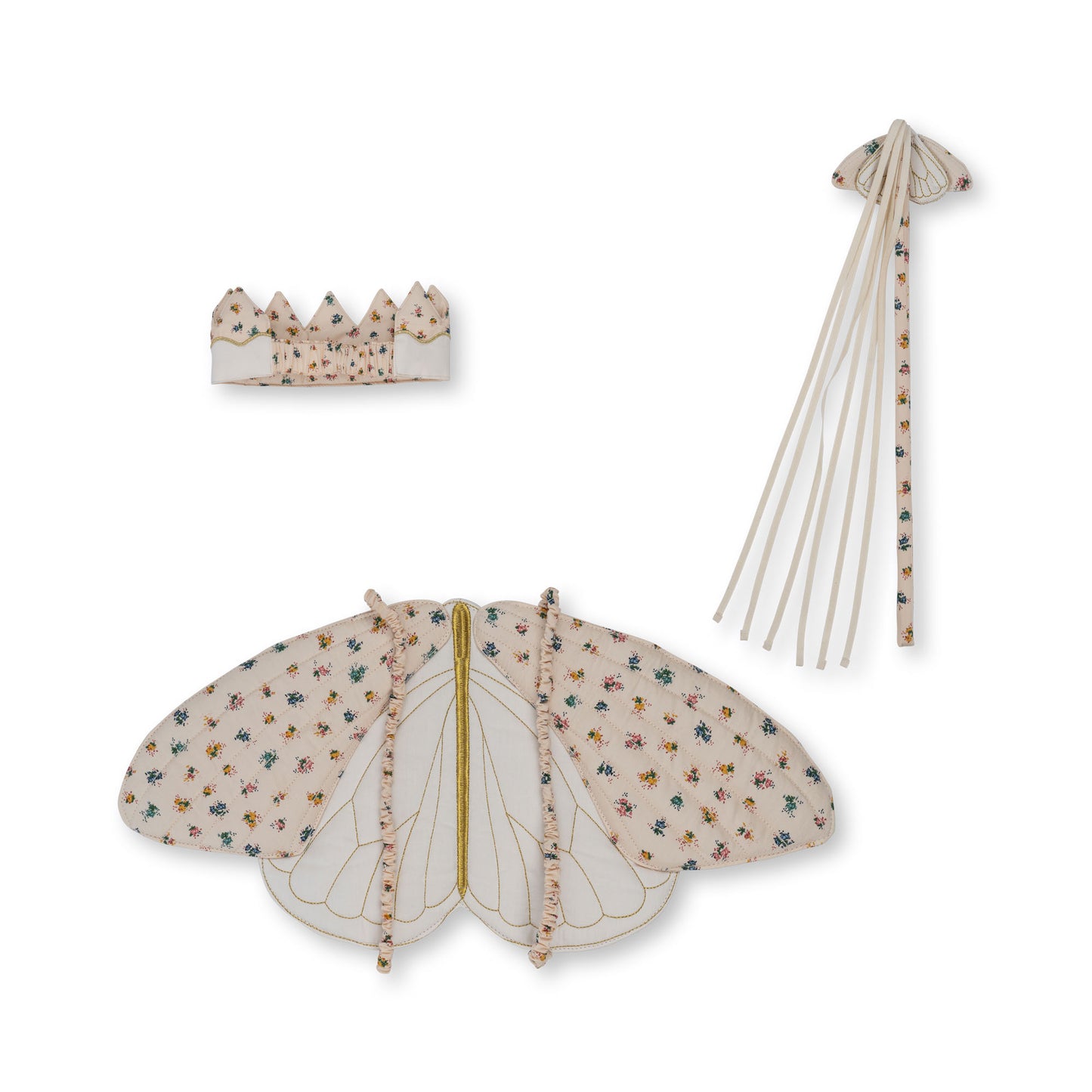 Tree-piece butterfly costume. Comes with a set of wings, a crown, and a wand Made from 100% organic cotton One size This product is OEKO-TEX STANDARD® 100, class 1 certified by DTI Tekstil, License Number: DTI 2276-361 Costume is for play only 3 yr +