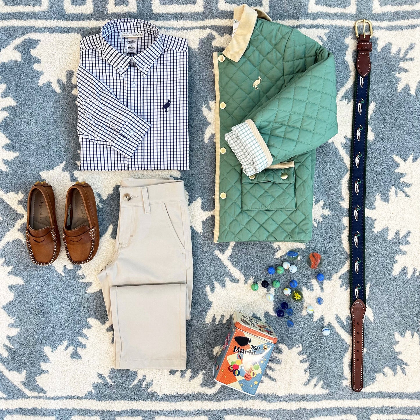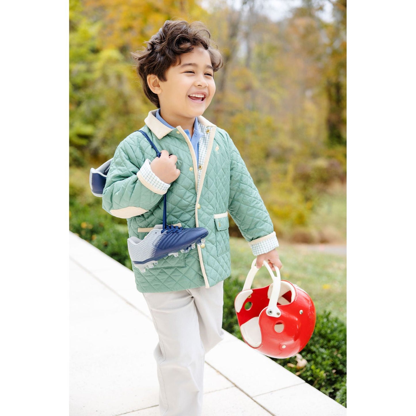 As the weather turns a bit more crisp, your little gent will love wearing our Caldwell Quilted Coat. Featuring Gallatin Green with Brass Buttons & Keeneland Khaki Corduroy Collar, this coat is ready for any adventure that comes his way!