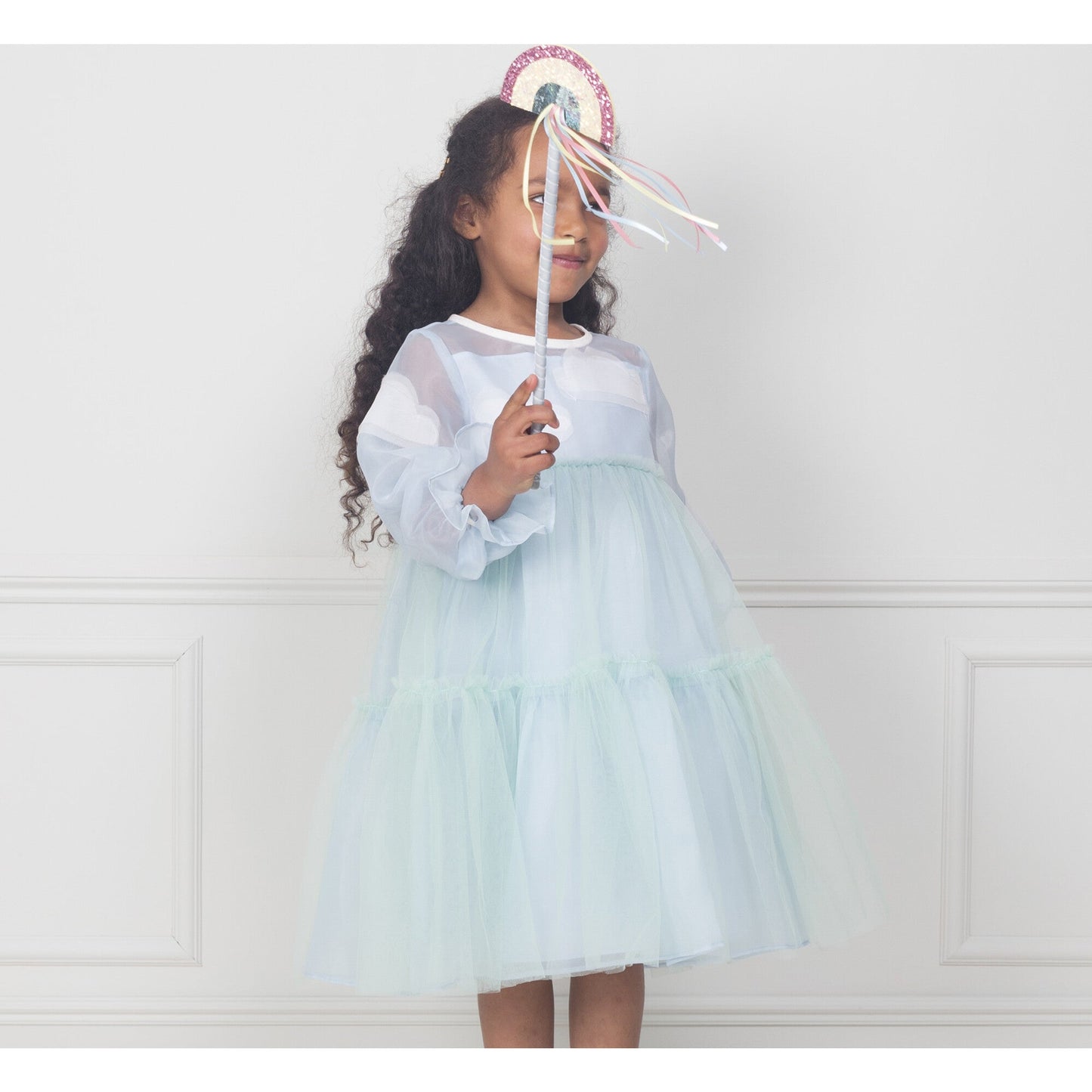 This charming cloud costume is perfect for kids who love to daydream and enjoy imaginative play. It is beautifully crafted from green tulle and blue organza, with white cloud details. It comes with a rainbow wand for casting happy spells.