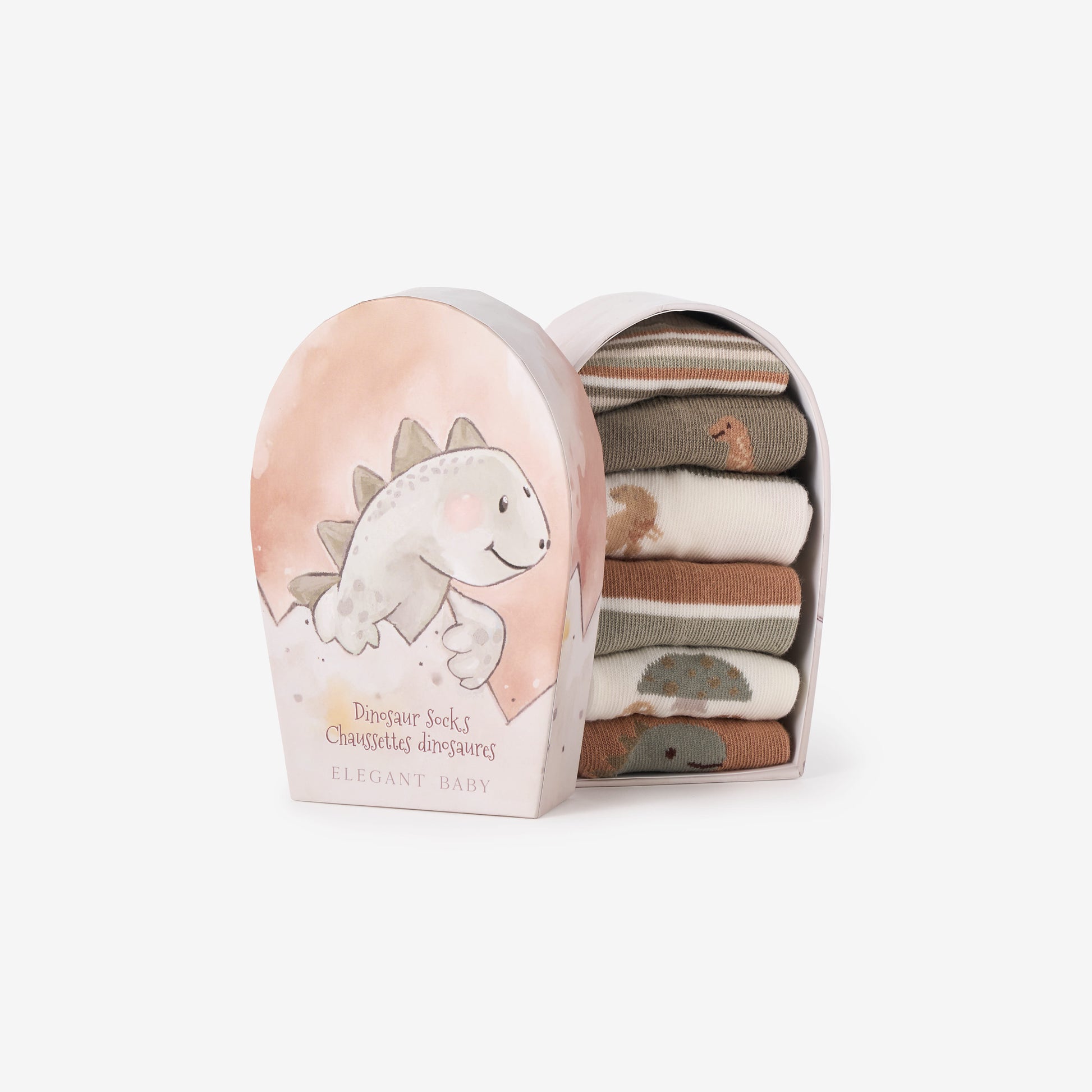Step into adventure with these non-slip baby socks, featuring playful dinosaur patterns in rust, olive green, and white. This 6-pack set is designed for little explorers, ensuring secure footing and cozy comfort with every step. Presented in a hand-illustrated gift box, it's a delightful choice for both practical and stylish gifting
