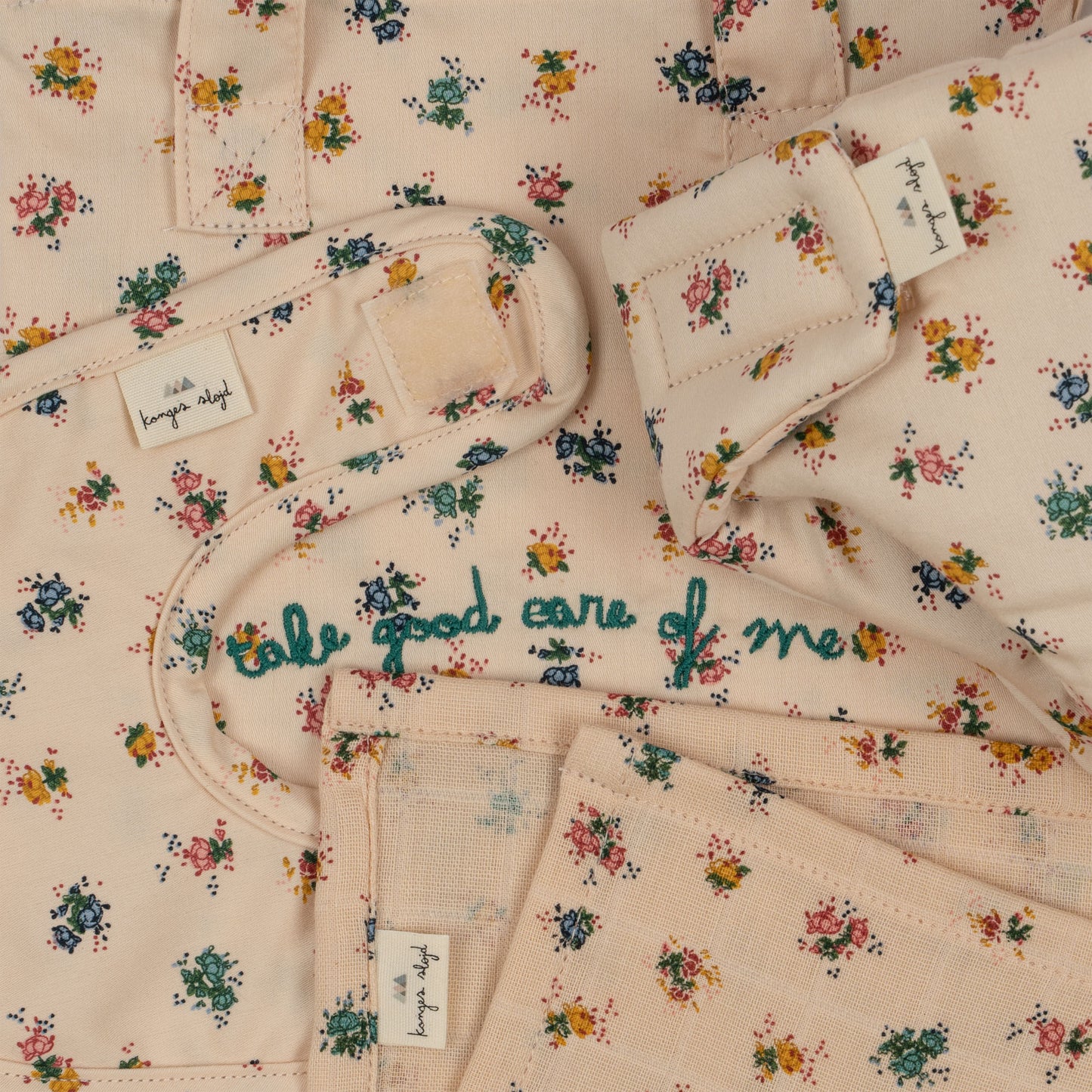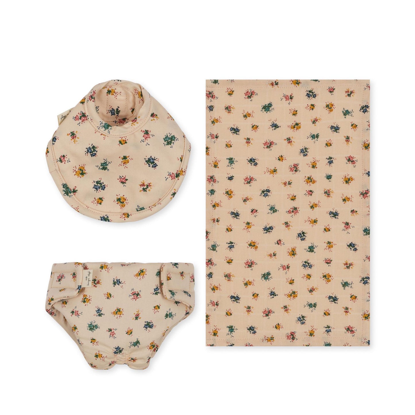 A complete nursery set for your child's favorite doll. Includes a bib, a diaper with velcro closure, and a soft cotton cloth. Made of 100% organic cotton. Bib: H 8.5 cm x W: 17 Bag: H: 28 cm x W: 19 cm Diaper: Waist width 17 cm Fits dolls size 35 cm and up WARNING! CHOKING HAZARD - Small parts. Not suitable for children under 3 years. 3 yr +