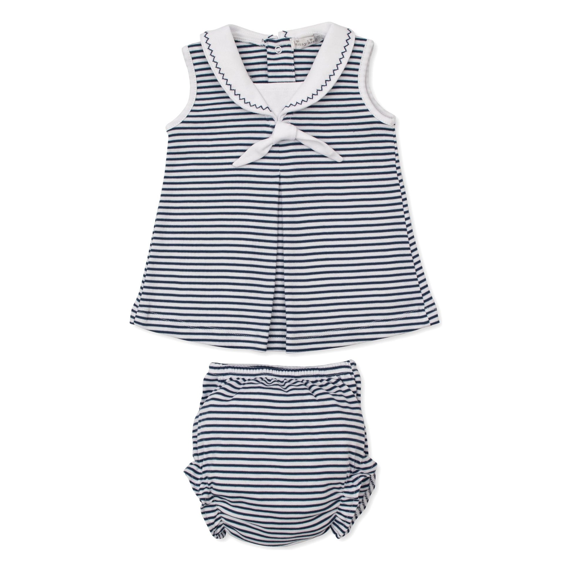 Rock the bold stripes of this Navy sleeveless dress set. Perfect for standing out in a crowd, while staying cool and comfortable. Get ready to be the center of attention with this stylish and playful outfit.