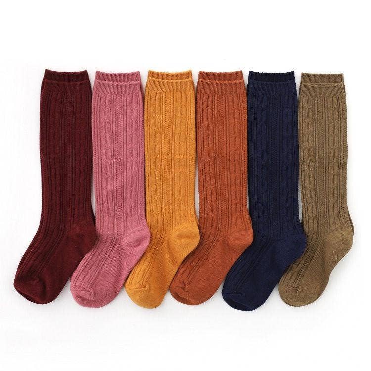 Cable Knit Knee High Socks for babies, toddlers and children! Wine, Mauve, Butterscotch, Sugar Almond, Navy and Olive.