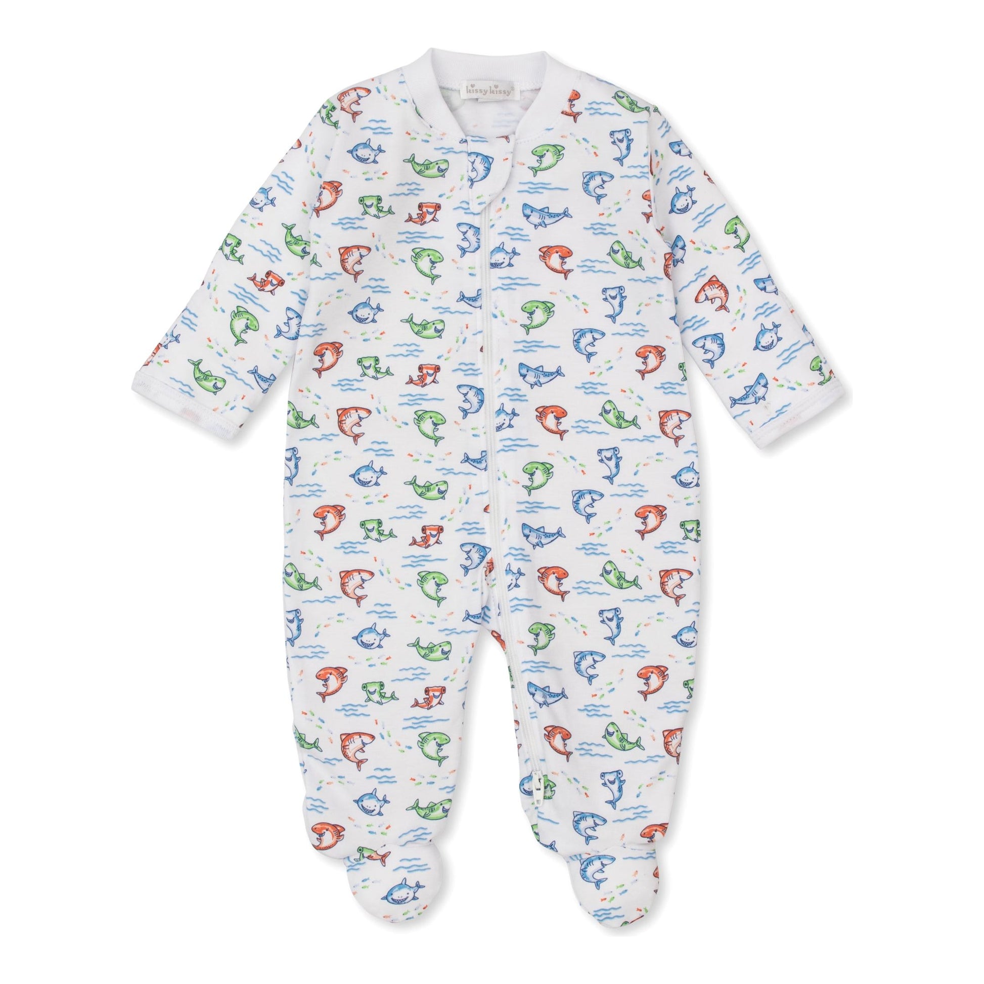 Get your little one ready for bed with our Shark Grins Zip Footie! Made from soft pima cotton, this infant boys sleeper is perfect for keeping your baby cozy and comfortable all night long. With an adorable shark print, this footie will make bedtime a little more fun.