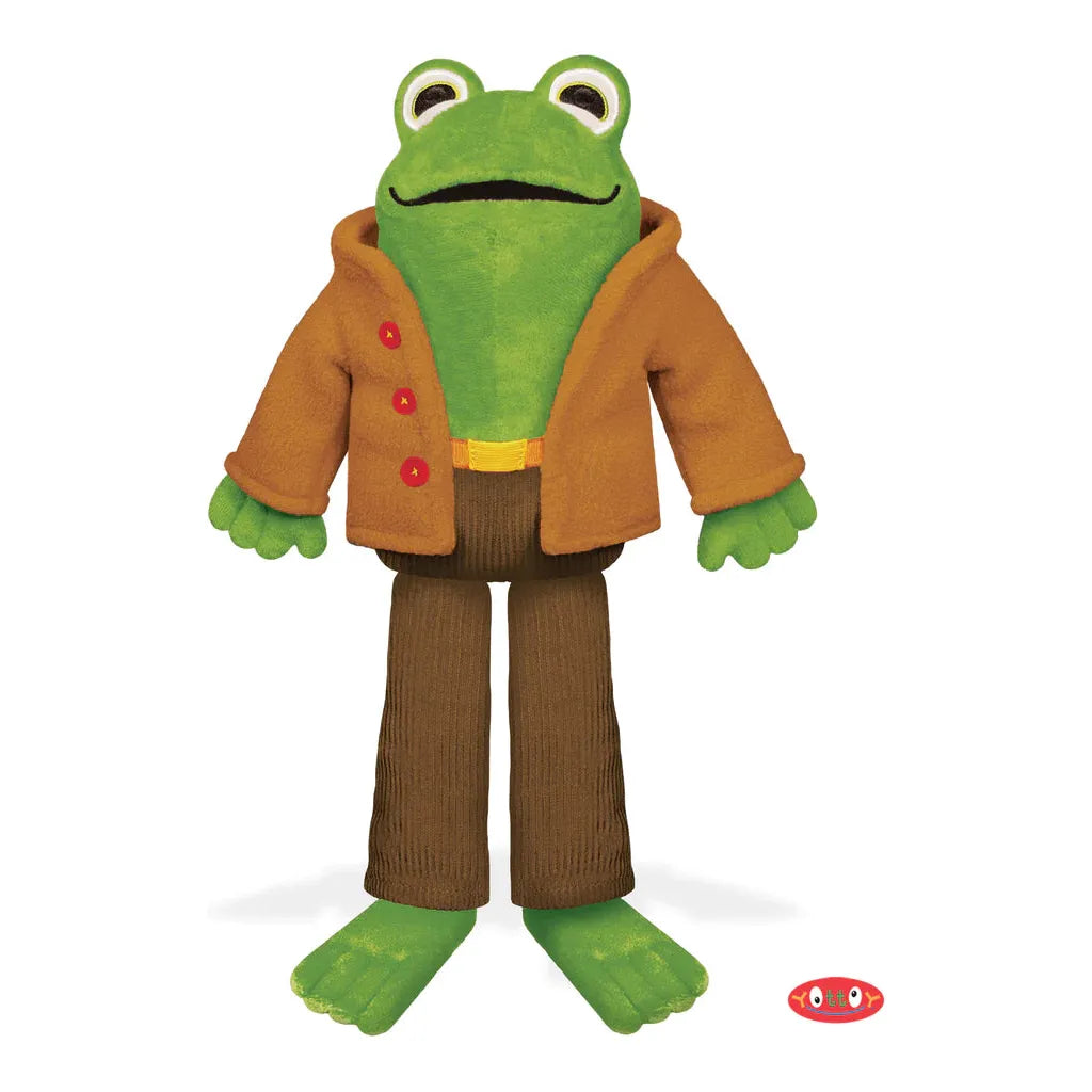 Tall and relaxed, Frog's bright green plush body is perfect for cuddling. Dressed in a warm camel-colored coat with red felt buttons and yellow hand-stitches, brown corduroy pants, and a grosgrain ribbon belt, Frog's embroidered eyes and optimistic expression are sure to win friends fast.