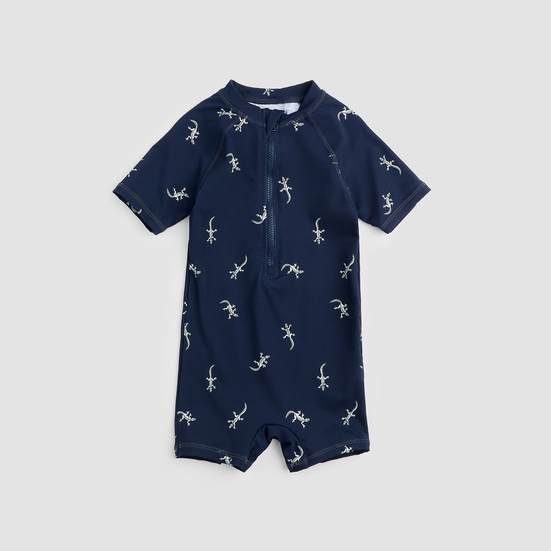 This playful romper has short sleeves and features a friendly gecko print. The navy one-piece has a zip down the front to make getting dry and dressed easy after a day of fun at the beach. Made from recycled materials with built-in UPF, the romper covers their torso while offering protection from the sun and sea.