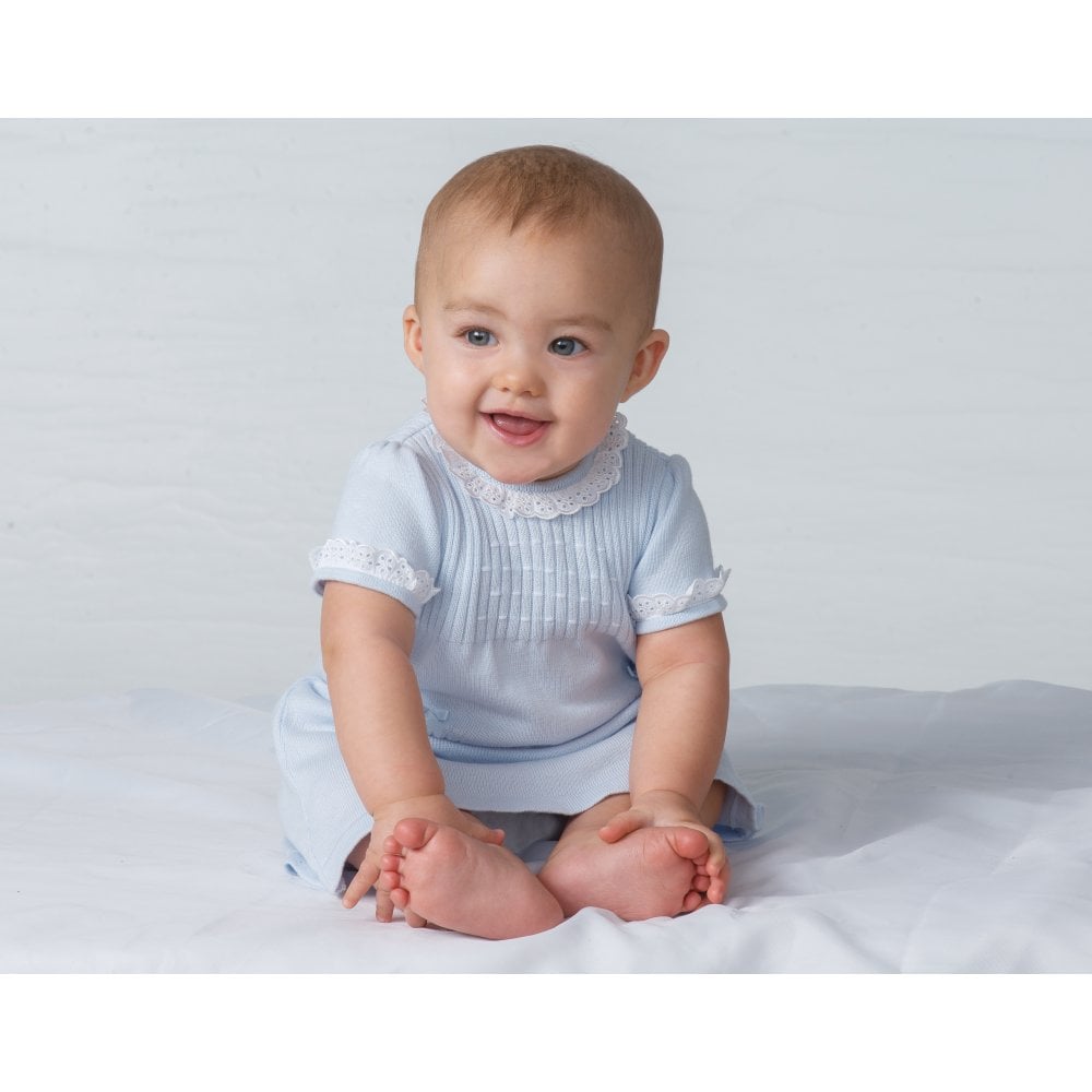 This Sarah Louise fine knit light blue dress is perfect for any young girl. Made with high-quality materials, it offers both comfort and style. The elegant design and delicate fabric make it suitable for any occasion. Elevate your little girl's wardrobe with this timeless piece.