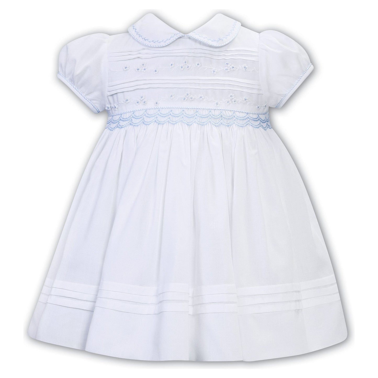 Elevate her style with this exquisite girls dress adorned with delicate tiny flowers and pretty scalloped embroidery in the hand smocking. The impeccable feather stitch detailing and the elegant bow fastening at the back with pearlescent buttons, make it the epitome of sophistication.