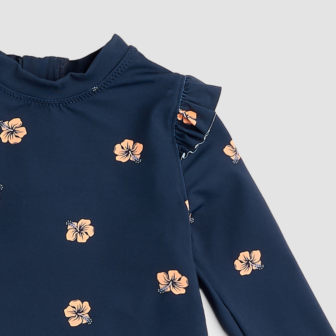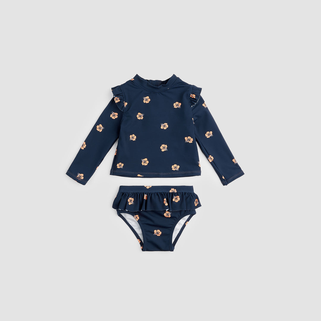 Hawaiian Hibiscus On Navy Long-Sleeve Rashguard Swim Set