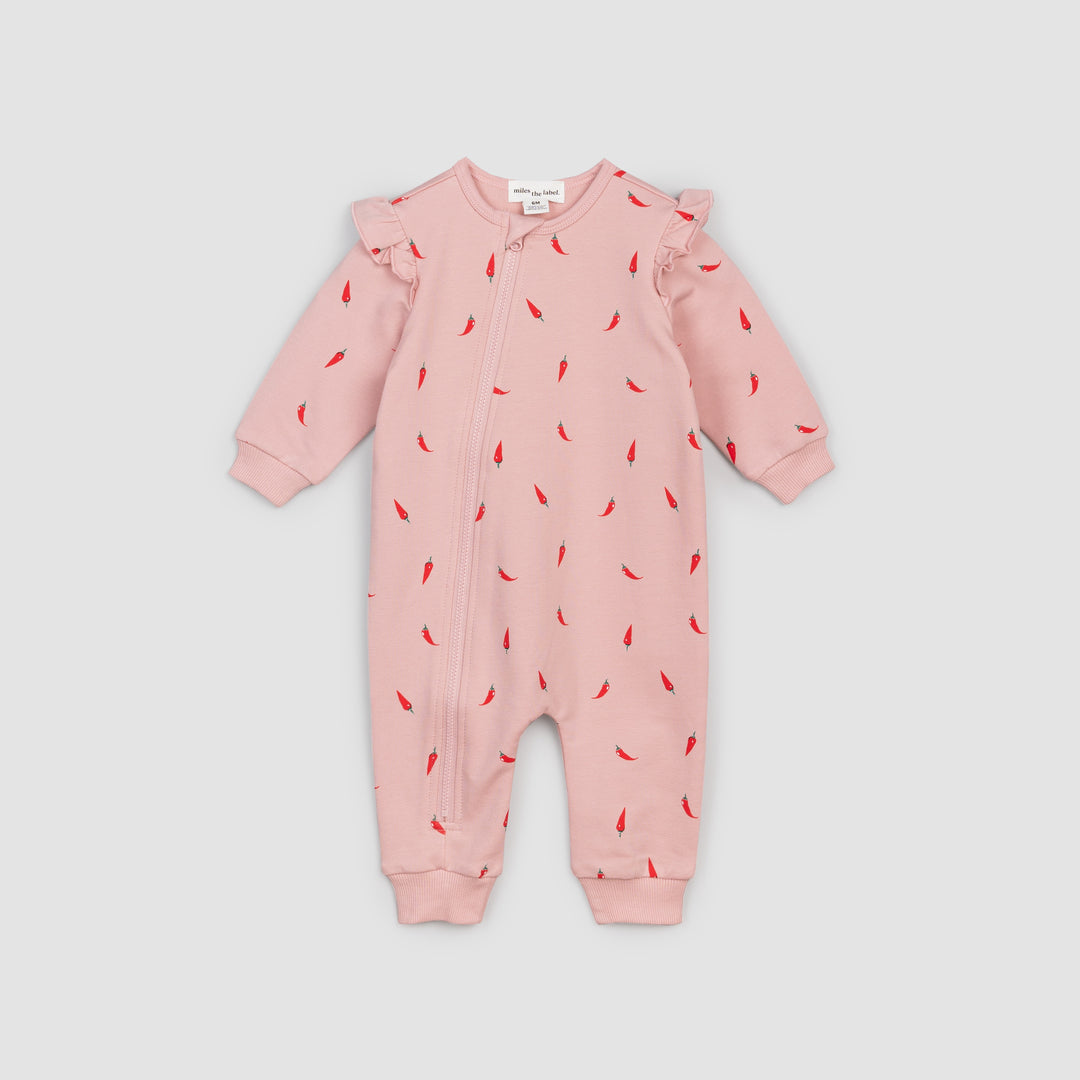 This fun and frilly playsuit features our chilli print all over and ruffle detailing on the shoulders. The pretty-in-pink playsuit is finished with ribbed cuffs and ankles which offer a snug fit while giving her the freedom to explore her surroundings with her fingers and toes. A full-length zip down the front of the suit makes dressing quick and easy.