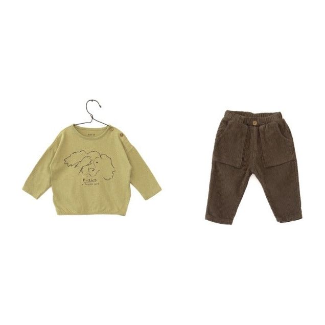This classic combination of a long sleeve t-shirt 50% organic cotton and 50% recycled cotton and brown pants is made with 100% ORGANIC COTTON . It's produced sustainably in Portugal to create a stylish set that's breathable, and eco-friendly.