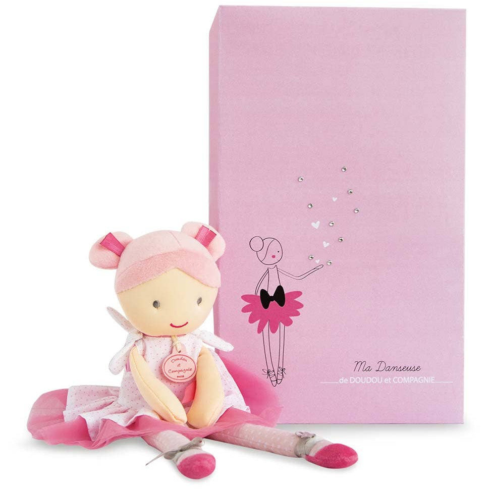 Beautiful ballet soft doll dressed in a pink dress with tulle and polka-dot tights and ballet slippers. Presented in a gift box. Suitable from birth+. Machine wash gentle cycle. 14.1" tall.