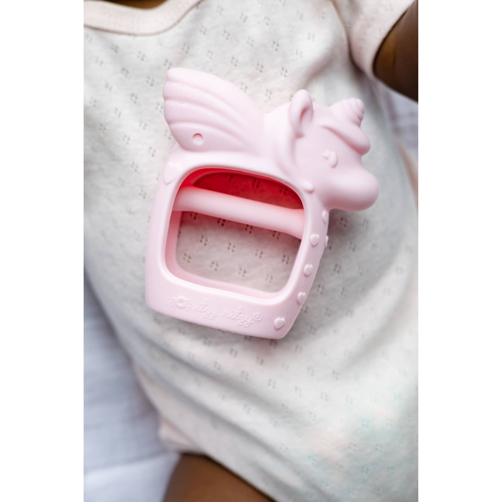 Chew On This! Relief is at hand! Our Bitzy Grip™ developmental teether is designed for baby's natural grasp reflex. Multiple textures and soft flexible silicone provide relief to sore gums at all stages of teething.