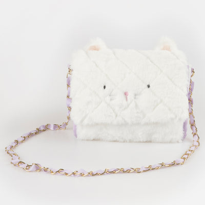 - The handbag is crafted from white plush with a white cotton lining and lilac piping