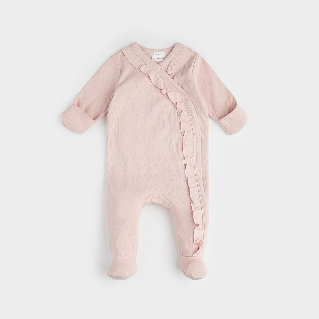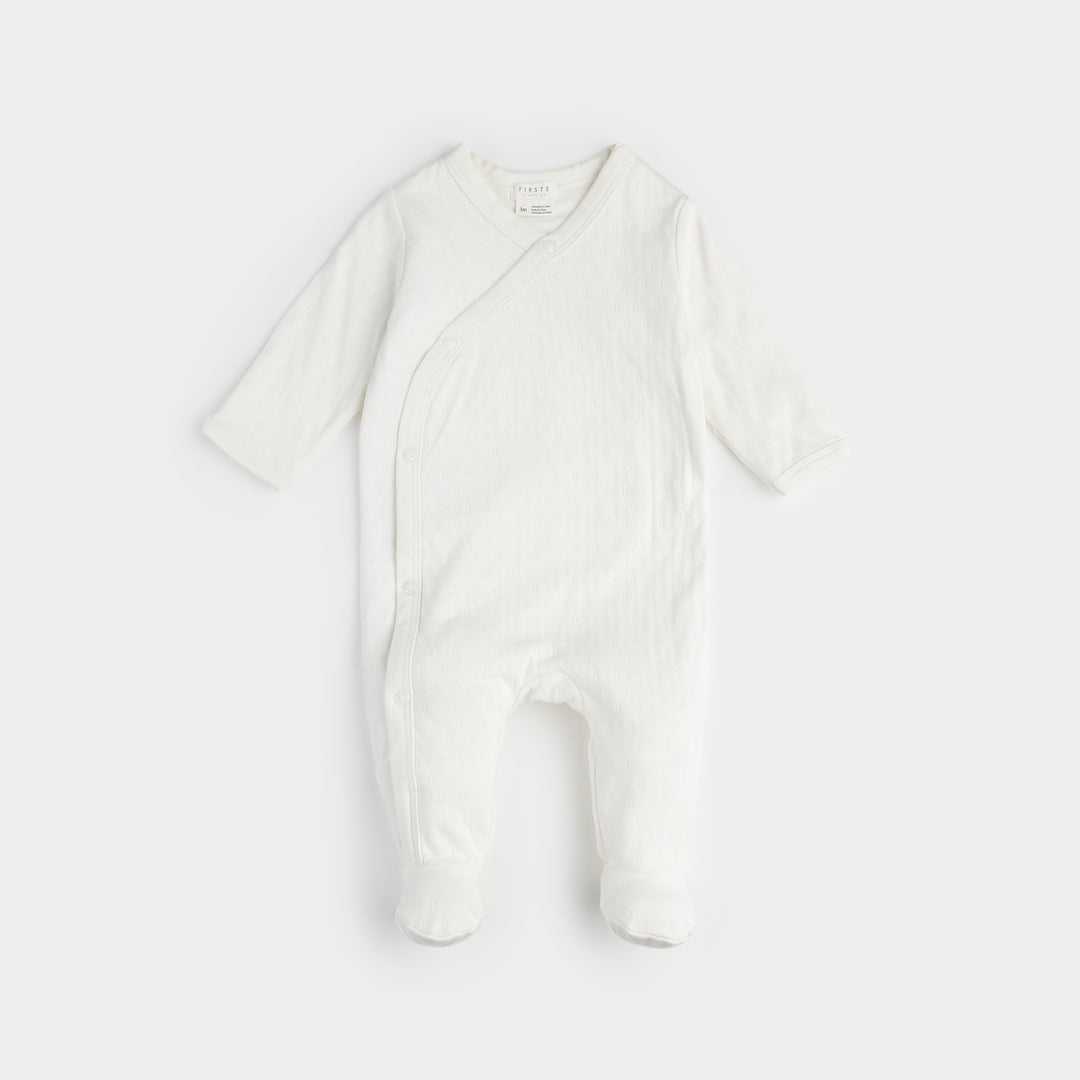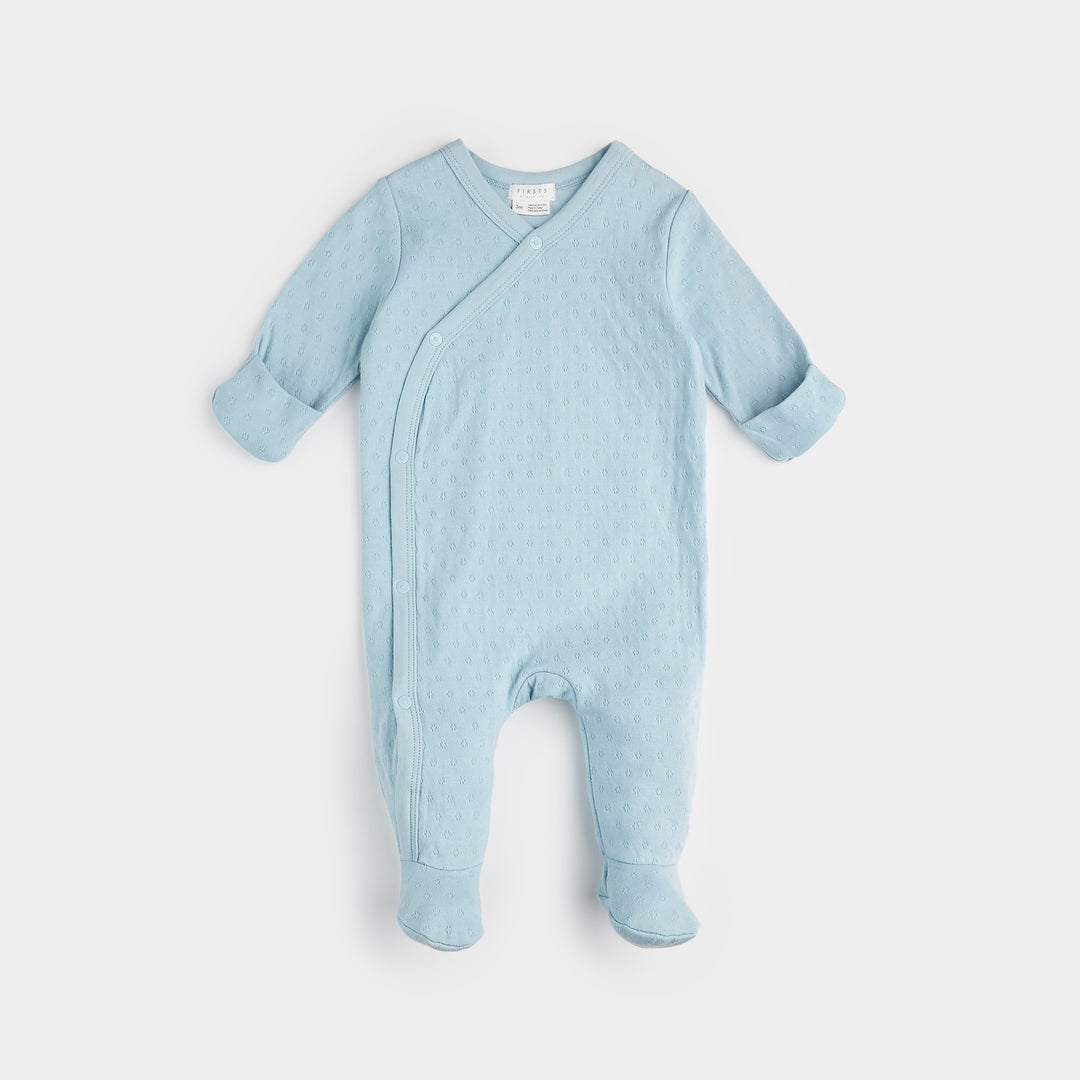 Perfect for bringing new arrivals home, this pointelle sleeper will keep them cozy and warm. The wrap around front with snap buttons makes bundling up your little one on chilly days easy without making diaper changes any more difficult. Integrated feet keep tiny toes warm but there’s a matching hat and blanket in the same range for extra coziness.