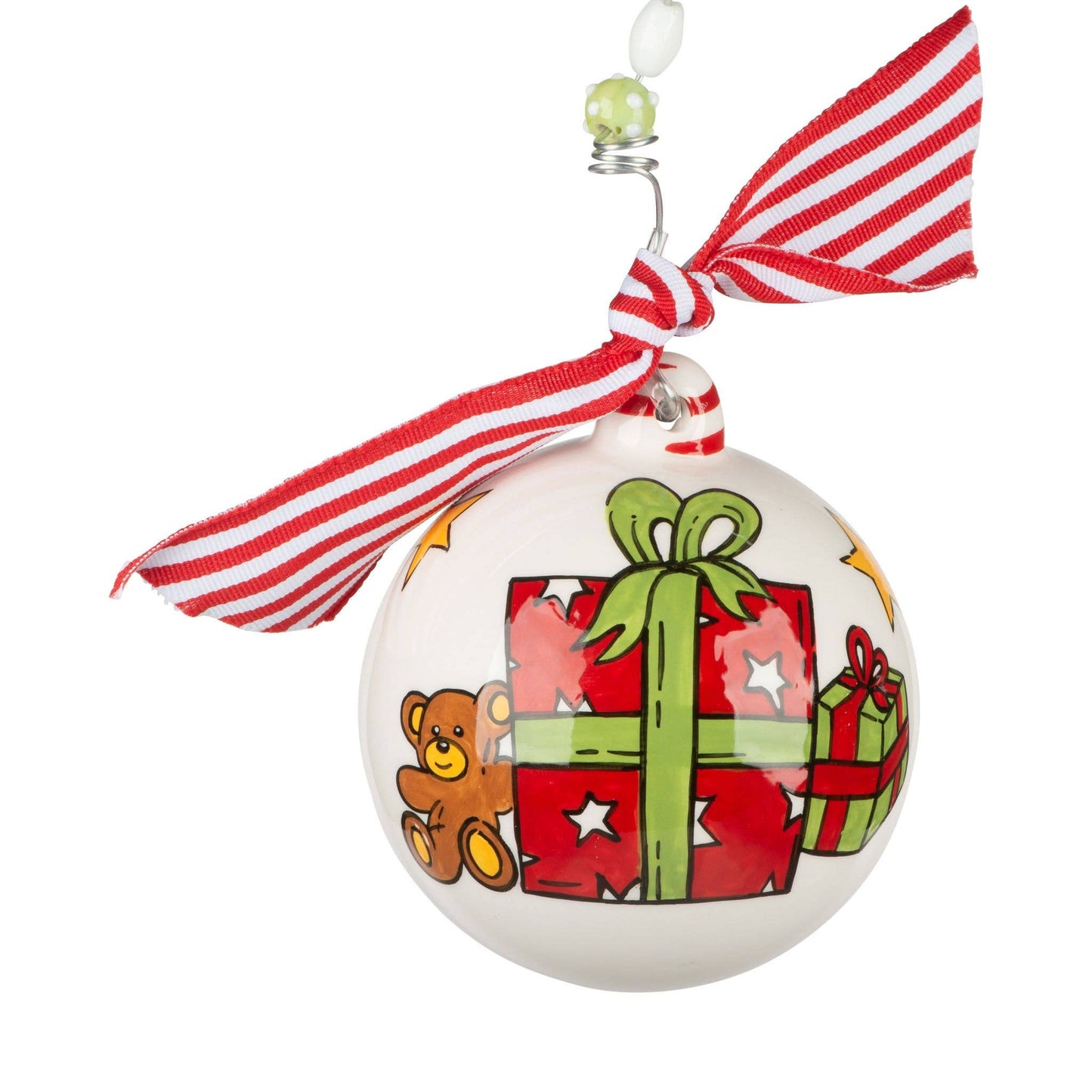 Who doesn't love presents and teddy bears! This beautiful Glory Haus ornament will put a smile on anyones face. The ornament comes ready to display with wire hanger, ribbon and glass beads!.