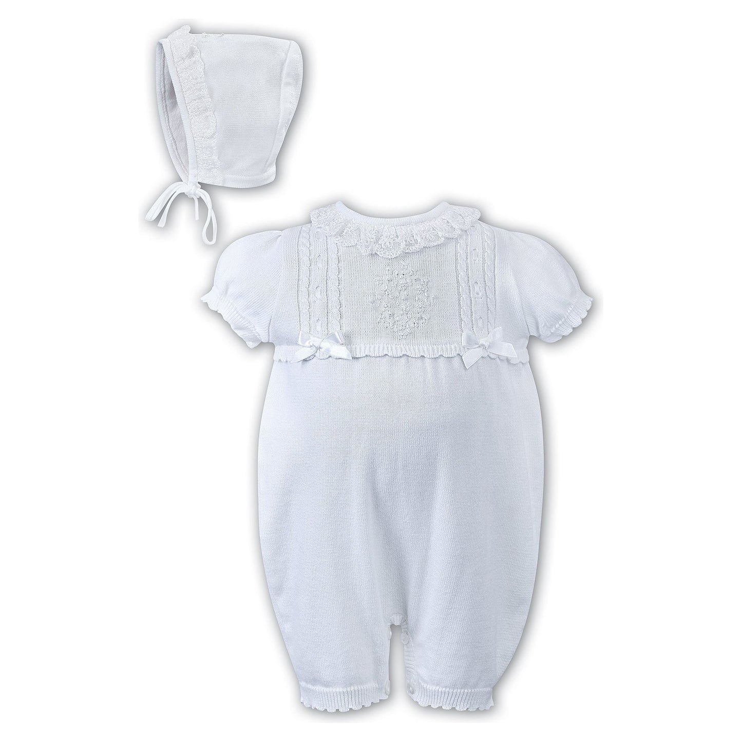 Our Heritage Line Bubble and Bonnet in , this knitwear is of 100% Organic Cotton with a delicate lace trim on the neckline. A Circular cluster of Hand-Embroider delicate flowers with tiny pearls.