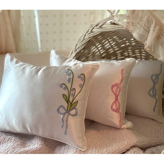 The sweetest way to celebrate baby is through our satin pillows. Pillowcases are 11” x 14” and zip off for easy laundering. Choose from embroidered bows in pink or blue or the lily of the valley design.