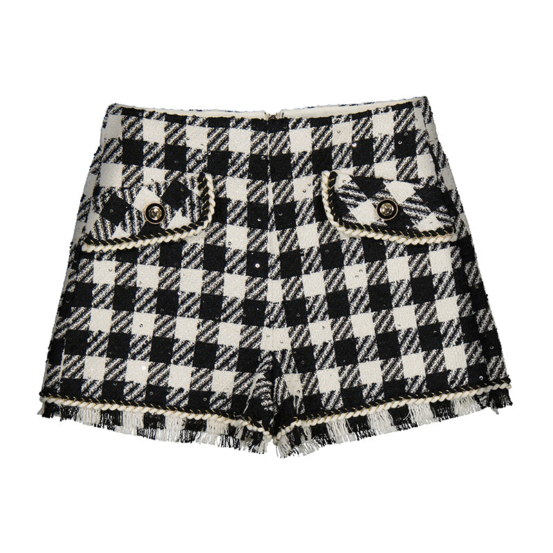 Add a fun twist to your little girl's wardrobe with these Sequins Bermuda shorts in classic black and white buffalo check. Perfect for playdates or casual outings, they combine bold pattern with a sparkly touch that keeps style playful and comfortable all day long.