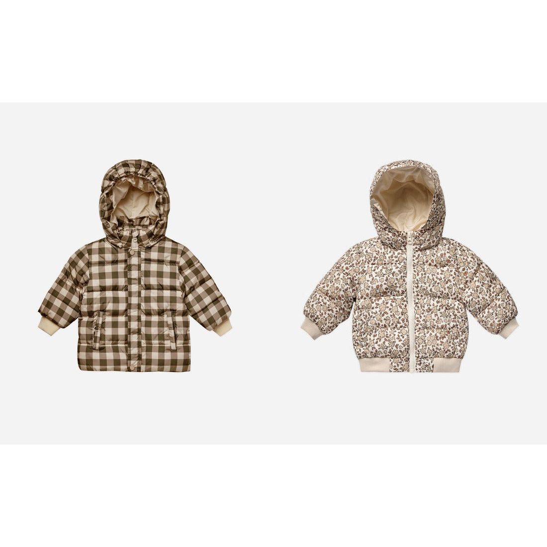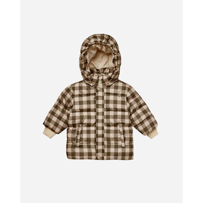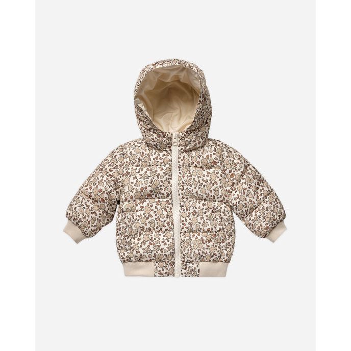 Our puffer jacket includes a hood with and elastic band at the top for a secure fit and a hidden zipper at the front.