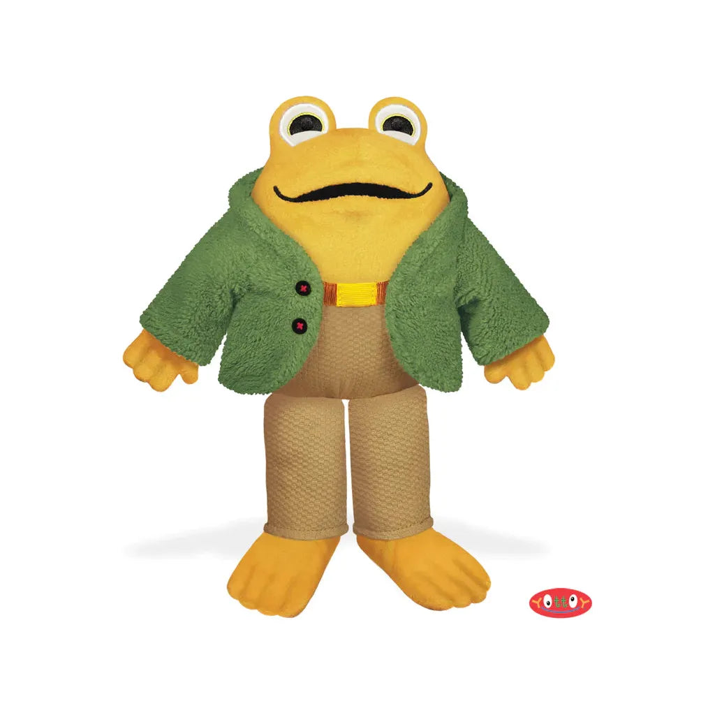 Shorter and plumper than his friend Frog, Toad sits with open arms, snuggly soft in his fully lined green furry jacket with black felt buttons and red hand-stitches, tan pique pants, and grosgrain ribbon belt. Made of caramel-colored soft plush, detailed embroidered eyes with a heartfelt expression, it's hard to resist giving Toad the warm hug he longs for.