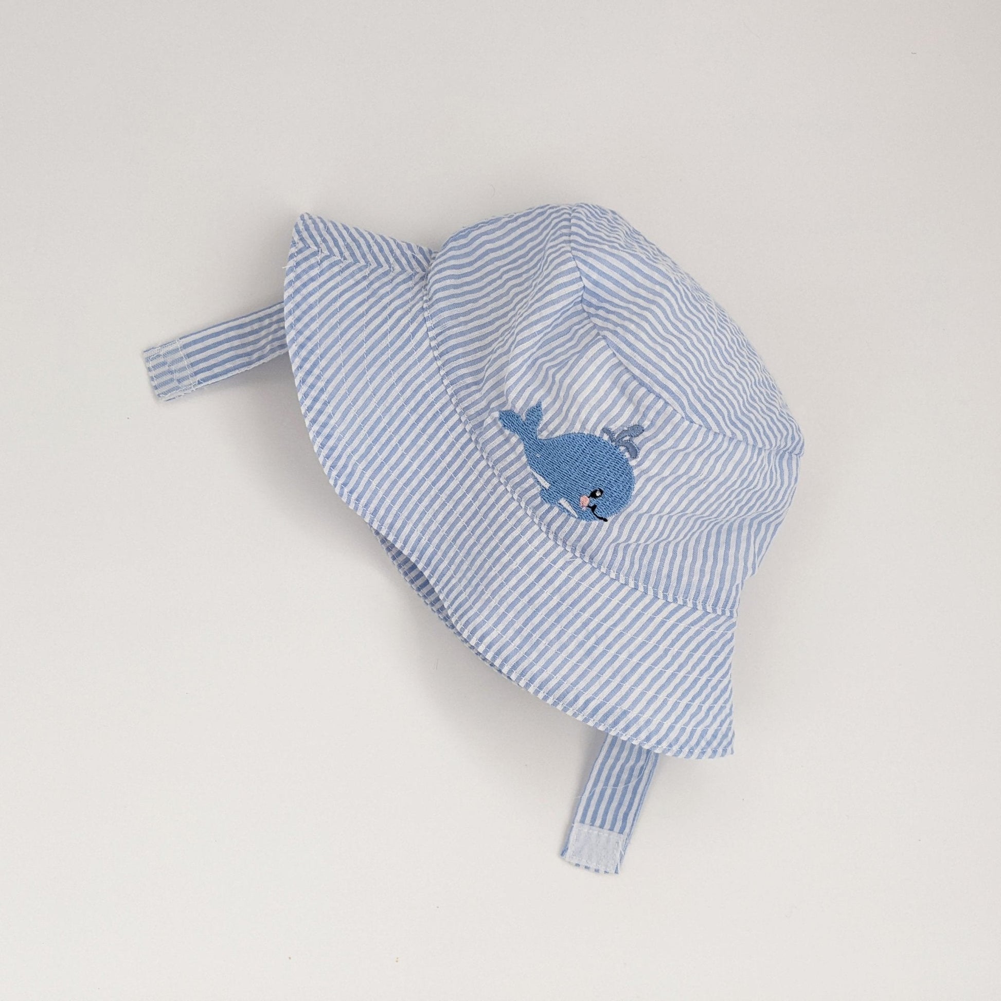 Perfect for the beach, and everyday wear, this lightweight UPF 25+ bucket style sun hat is functional and cute. Made in blue and white seersucker fabric, it's embroidered with a cute whale. The chin strap velcros in place to keep hat in place.