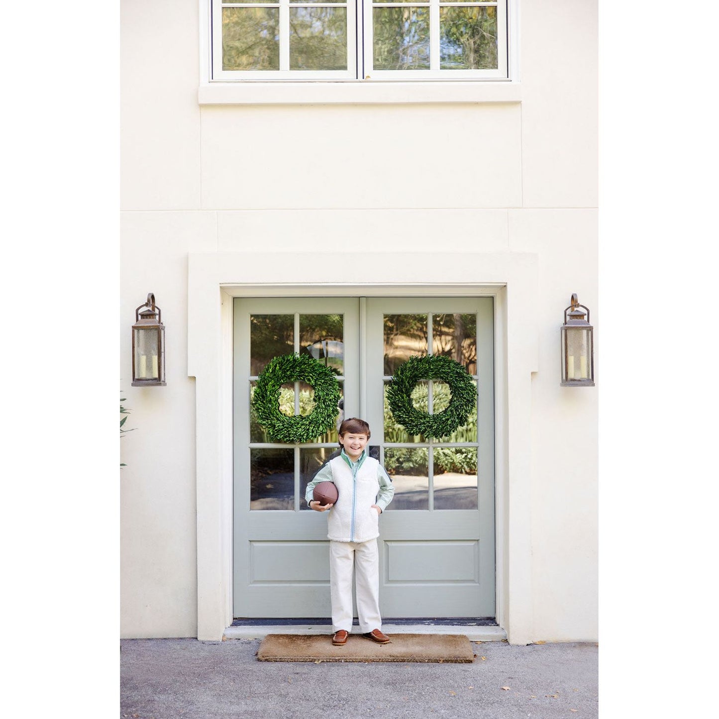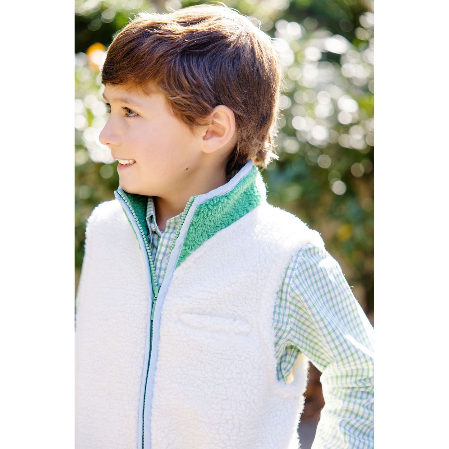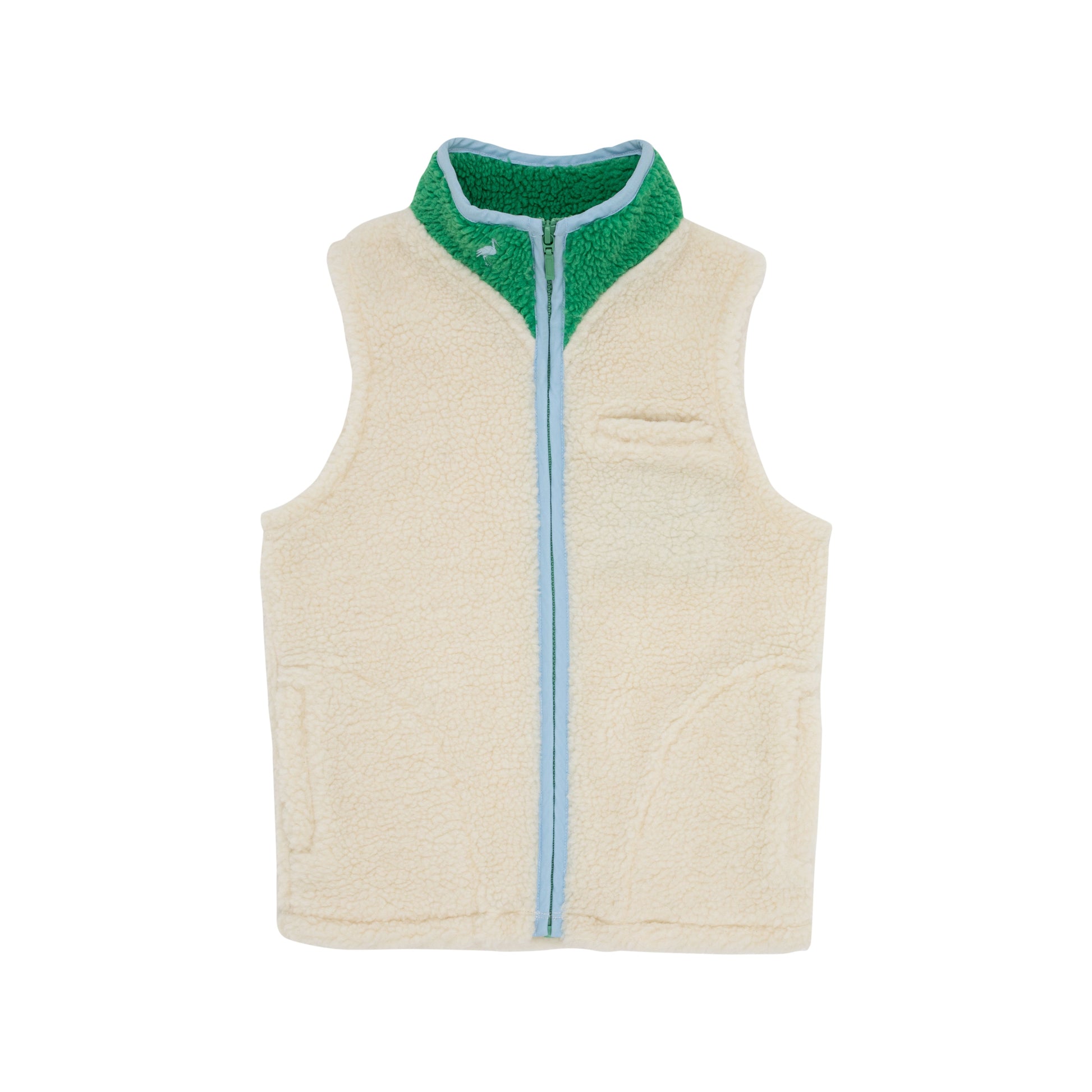 The Van Camp Vest is a perfect layering option for your little gent. Featuring Palmetto Pearl Sherpa with Kiawah Kelly Green and Barrington Blue, and Nantucket Navy/Palmetto Pearl/Barrington Blue he's sure to be two things: warm & handsome!