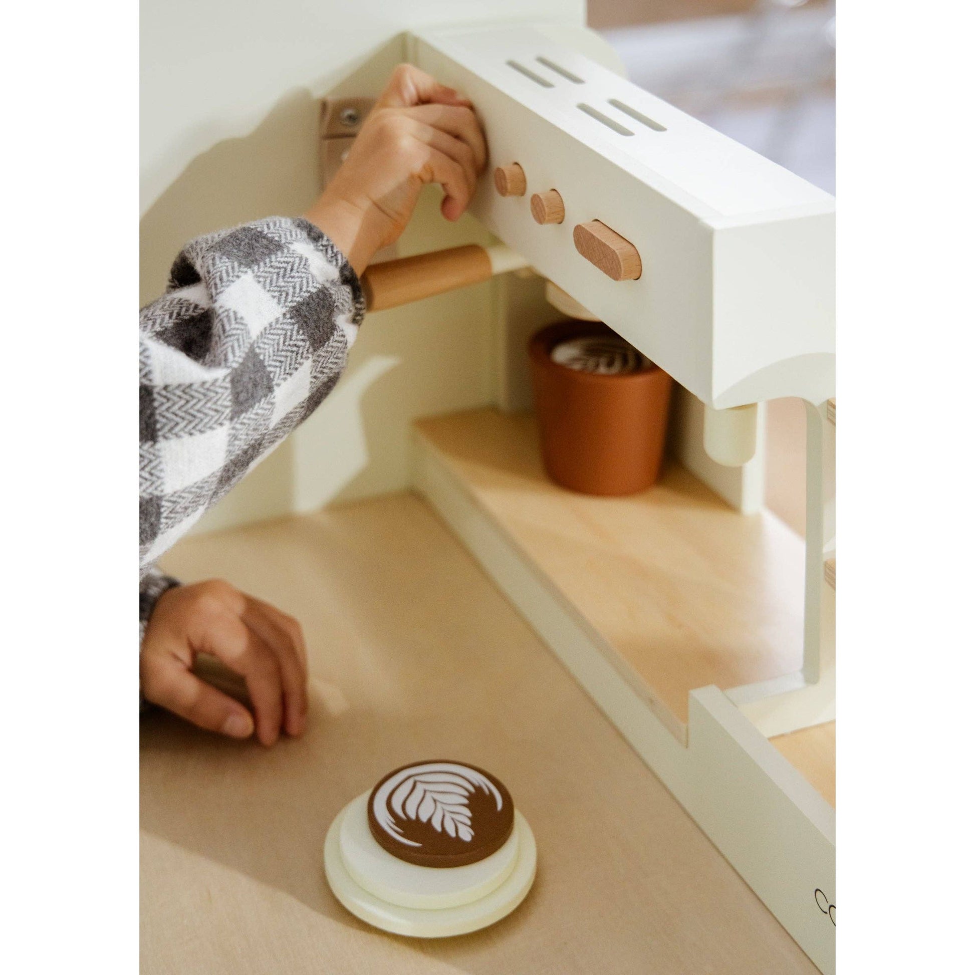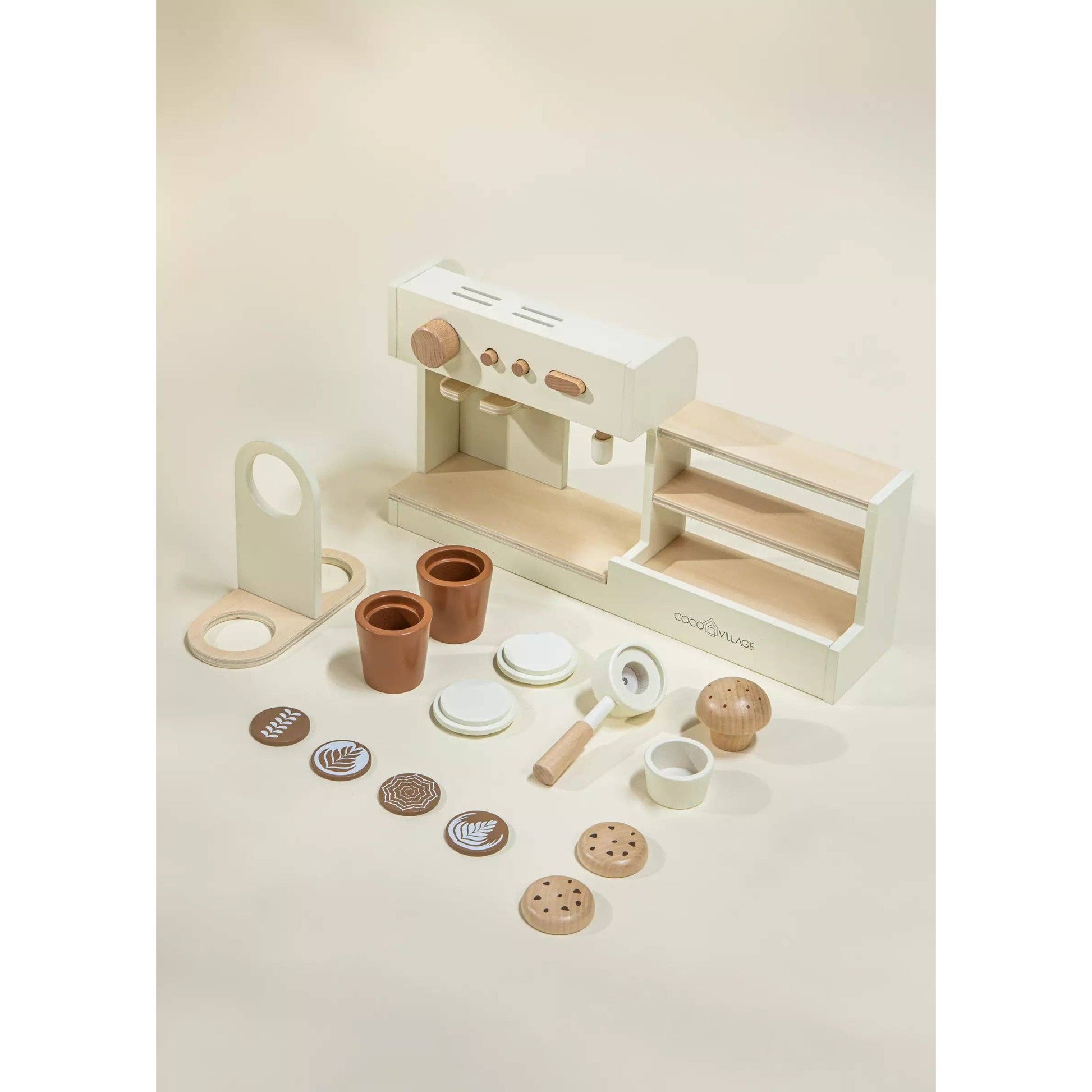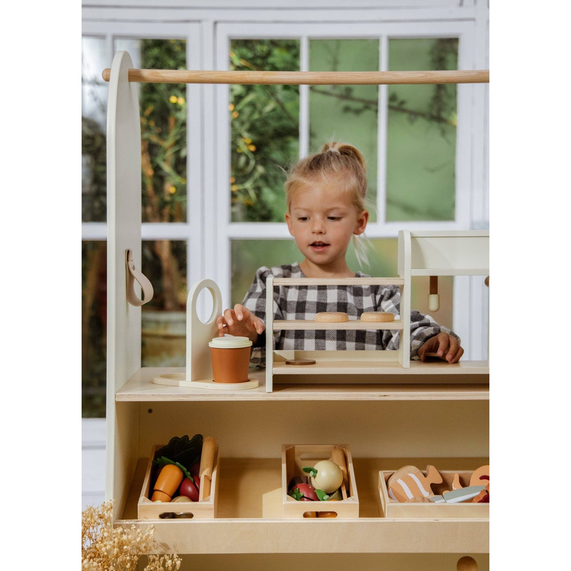 Brew up some fun with the Wooden Coffee Shop Playset! Let your little baristas take orders, whip up imaginary lattes, and serve pretend pastries. This playset is perfect for sparking creativity and social play. Watch as they create the cutest coffee shop in town, filled with endless giggles, realistic looking lattes and delicious imaginary treats.
